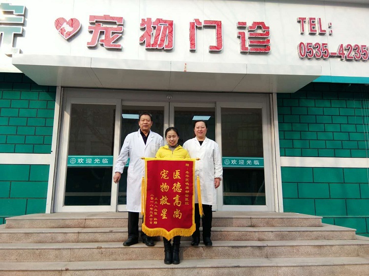 當日,“虎”的主人趙女士為牟平區鳴康動物醫院寵物門診的張典玉、孫霞兩位寵物醫師以及全院的工作者送來錦旗,錦旗上寫“醫德高尚 寵物救星”。