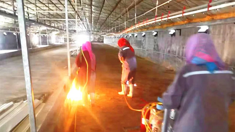 在上一批種雞順利出欄后,第七種雞場在空舍期內,在對所有雞舍進行了徹底清洗的基礎上,又先后進行了一次火焰消毒、二次高效消毒劑噴霧消毒、一次表面噴漿處理和一次熏蒸消毒。