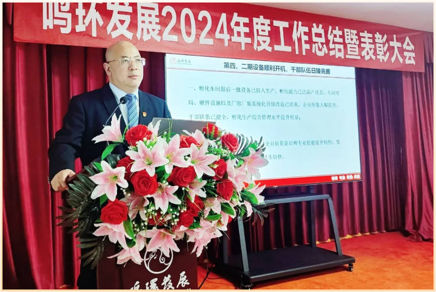 宋永董事長指出,2024年,對鳴環發展而言,是極其不平凡的一年,大家在鳴環發展董事會的領導下,踔厲奮發,積極應對,克服了種種困難,取得了顯著成績。企業高端市場區域明顯擴大,高價值客戶顯著增多,產品競爭力持續增強,職業化干部隊伍建設穩步推進,現代化企業管理體系日臻完善,可持續發展的核心競爭力穩步提升。鳴環在行業中的知名度、關注度和美譽度迅速提升,“鳴環金雛”目前已成為白羽雞苗領先品牌,產品供不應求!